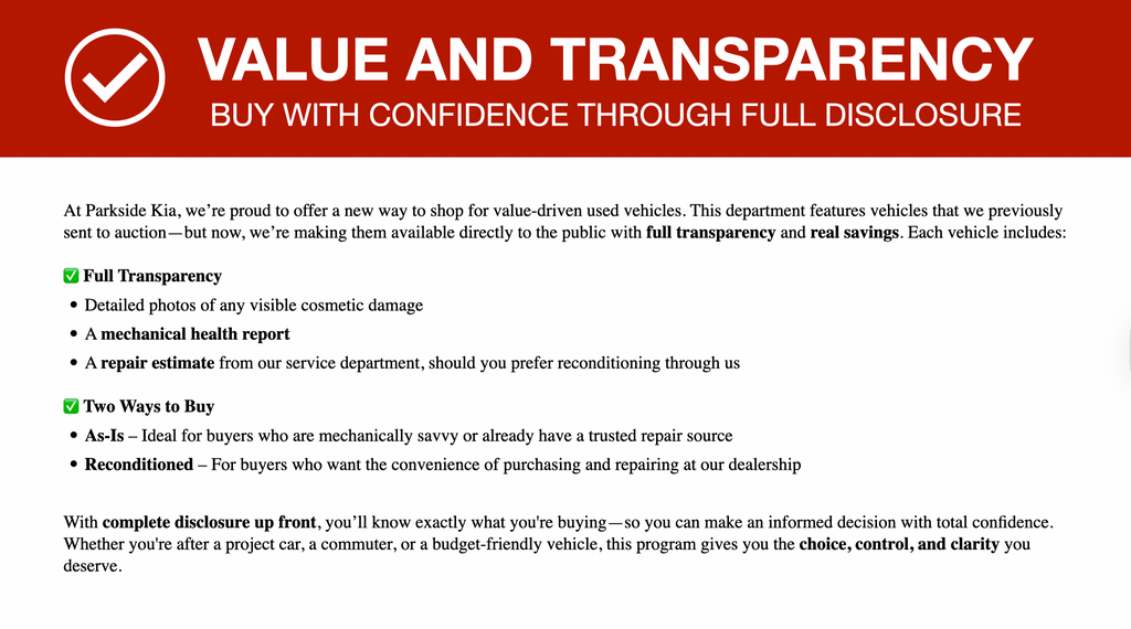 At Parkside Kia, we’re proud to offer a new way to shop for value-driven used vehicles. This department features vehicles that we previously sent to auction—but now, we’re making them available directly to the public with full transparency and real savings. Each vehicle includes:
