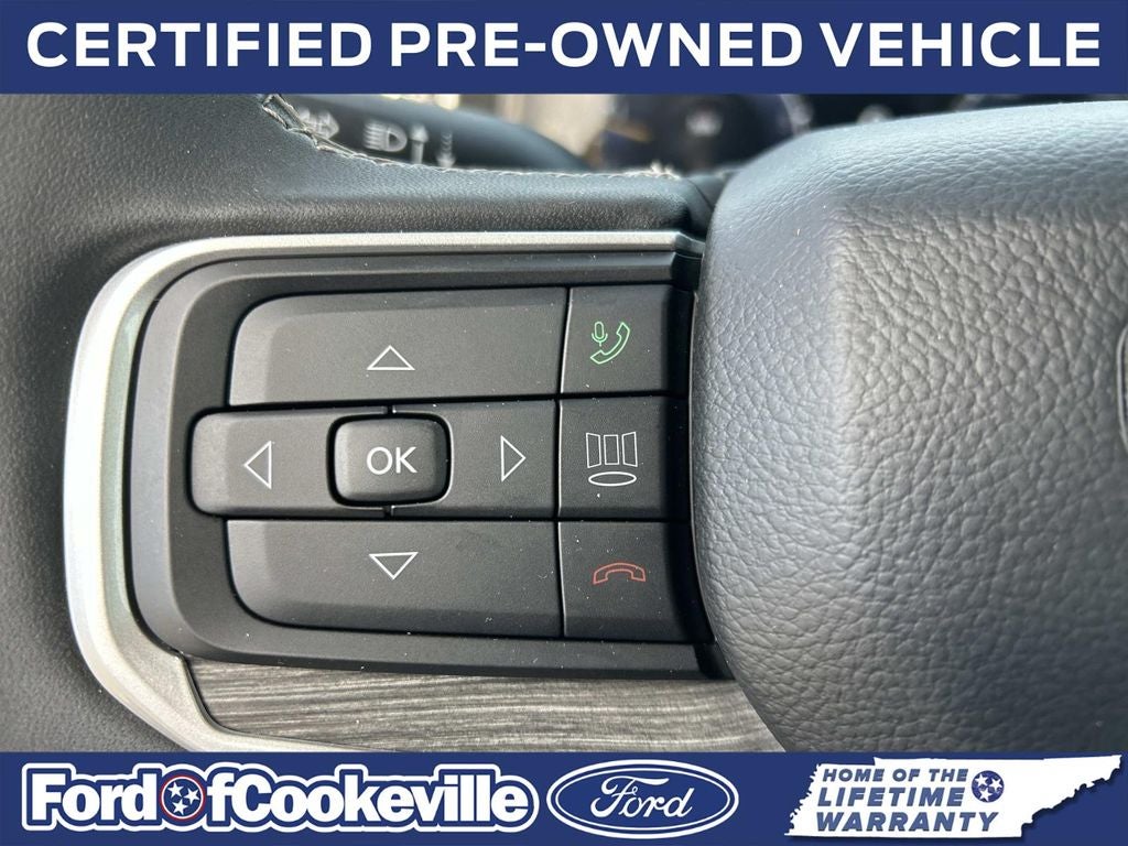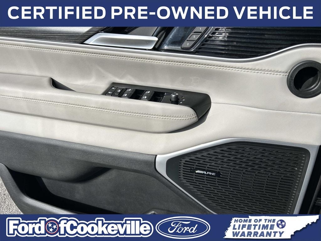This Vehicle Includes the Following Features and Options: Preferred Equipment Group (60/40 Power Recline 3rd Row Seat, Heads-Up Display, Quadra-Lift Air Suspension, and Semi Active Damping), Quick Order Package 25N, FORD BLUE Certified, 10 Speakers, 20 x 9.0 Aluminum Wheels, 3.55 Rear Axle Ratio, 3rd row seats: bench, 4-Wheel Disc Brakes, ABS brakes, Adjustable pedals, Air Conditioning, Alloy wheels, AM/FM radio: SiriusXM with 360L, Anti-whiplash front head restraints, Audio memory, Auto High-beam Headlights, Auto-dimming door mirrors, Auto-dimming Rear-View mirror, Auto-leveling suspension, Automatic temperature control, Brake assist, Bumpers: body-color, Compass, Delay-off headlights, Driver door bin, Driver vanity mirror, Driver's Seat Mounted Armrest, Dual front impact airbags, Dual front side impact airbags, Electronic Stability Control, Emergency communication system: Automatic SOS Call, Exterior Parking Camera Rear, Four wheel independent suspension, Front anti-roll bar, Front Bucket Seats, Front Center Armrest w/Storage, Front dual zone A/C, Front fog lights, Front reading lights, Fully automatic headlights, Garage door transmitter, Genuine wood console insert, Genuine wood dashboard insert, Genuine wood door panel insert, Heated door mirrors, Heated front seats, Heated rear seats, Heated steering wheel, Illuminated entry, Knee airbag, Leather Trimmed Bucket Seats, Low tire pressure warning, Memory seat, Navigation System, Normal Duty Suspension, Occupant sensing airbag, Outside temperature display, Overhead airbag, Overhead console, Panic alarm, Passenger door bin, Passenger seat mounted armrest, Passenger vanity mirror, Pedal memory, Power adjustable front head restraints, Power door mirrors, Power driver seat, Power Liftgate, Power passenger seat, Power steering, Power windows, Radio data system, Radio: Uconnect 5 Nav w/10.1 Display, Rain sensing wipers, Rear air conditioning, Rear anti-roll bar, Rear dual zone A/C, Rear reading lights, Rear seat center armrest, Rear window defroster, Rear window wiper, Reclining 3rd row seat, Remote keyless entry, Security system, Speed control, Speed-sensing steering, Speed-Sensitive Wipers, Split folding rear seat, Steering wheel memory, Steering wheel mounted audio controls, Tachometer, Telescoping steering wheel, Tilt steering wheel, Traction control, Trip computer, Turn signal indicator mirrors, Variably intermittent wipers, Ventilated front seats, and Voltmeter.
