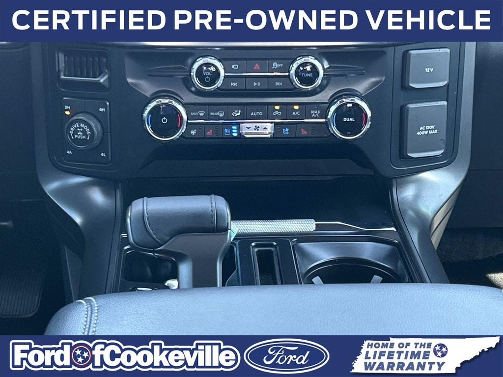 This Vehicle Includes the Following Features and Options: Equipment Group 501A Mid (6 Angular Bright Anodized Step Bar, Illuminated Driver & Passenger Visors, and Power-Sliding Rear Window), FX4 Off-Road Package (4x4 FX4 Off-Road Bodyside Decal, Electronic Locking w/3.31 Axle Ratio, Hill Descent Control, Monotube Rear Shocks, Off-Road Tuned Front Shock Absorbers, Rock Crawl Mode, and Tray Style Floor Liner w/o Carpet Mats), Lariat Black Appearance Package (ActiveX Trimmed Bucket Seats (B), Black Exterior Badging, Black Grille, Black Taillamp Bezels, Body-Color Front & Rear Bumpers, Body-Color Skull Caps & Door Handles, Dark Interior Appliques, Gray Box Side Decal, and Matte Black Tailgate F-150 Decal), FORD GOLD Certified, 4WD, Navigation system: Connected Navigation, Wheels: 20 Gloss Black Painted Aluminum, 4-Wheel Disc Brakes, 8 Speakers, ABS brakes, ActiveX Trimmed Bucket Seats, Adjustable pedals, Air Conditioning, AM/FM radio: SiriusXM with 360L, Auto High-beam Headlights, Auto-dimming door mirrors, Auto-dimming Rear-View mirror, Automatic temperature control, Brake assist, Bumpers: chrome, Compass, Delay-off headlights, Driver door bin, Driver vanity mirror, Dual front impact airbags, Dual front side impact airbags, Electronic Stability Control, Emergency communication system: SYNC 4 911 Assist, Front anti-roll bar, Front Bucket Seats, Front Center Armrest, Front dual zone A/C, Front fog lights, Front reading lights, Front wheel independent suspension, Fully automatic headlights, Garage door transmitter, Heated door mirrors, Heated front seats, Heated steering wheel, Illuminated entry, Internet access capable: FordPass Connect 5G, Low tire pressure warning, Memory seat, Occupant sensing airbag, Outside temperature display, Overhead airbag, Overhead console, Panic alarm, Passenger door bin, Passenger vanity mirror, Pedal memory, Power door mirrors, Power driver seat, Power passenger seat, Power steering, Power windows, Radio data system, Radio: B&O Sound System by Bang & Olufsen, Rain sensing wipers, Rear reading lights, Rear seat center armrest, Rear step bumper, Rear window defroster, Remote keyless entry, Security system, Speed control, Split folding rear seat, Steering wheel mounted audio controls, SYNC 4 w/Enhanced Voice Recognition, Tachometer, Telescoping steering wheel, Tilt steering wheel, Traction control, Trip computer, Turn signal indicator mirrors, Variably intermittent wipers, Ventilated front seats, and Voltmeter.